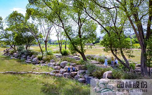 旁邊的一個樹島,用柴火和鋼管做出“鳥巢”形狀,雖稍顯“凌亂”,但卻顯得分外自然;再前方的一個樹島,增加“五指”塑石景觀,遠(yuǎn)遠(yuǎn)看去,好像一只大手托舉著大樹;穿過田間小路,來到幾棵大樹組成的樹林,錯落有致的景石形成一個自然的圍合空間,林間小路用舊木頭鋪成,道路兩邊用紫色鼠尾草、刀茅等植物巧妙搭配出清新的花境,坐在樹下的石頭上小憩,看著孩子們在追逐嬉戲,仿佛回到了兒時和小伙伴在村口大樹下游玩打鬧的時光,關(guān)于故鄉(xiāng)的回憶充盈在心間。