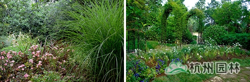 入口視線落腳點以粉黛亂子草+大濱菊花帶為中景,以紫絨鼠尾草+亞麻“紅劍”+微型月季“玫紅”為前景,在細葉芒的掩映下,將花園內(nèi)部形成若隱若現(xiàn)的效果;木香花架側(cè)采用花帶式種植,利用粉黛亂子草可達1.5m以上的枝葉進行空間分割,形成既與周圍環(huán)境風格統(tǒng)一又相對私密的花園獨立空間。并采用大濱菊做邊緣隔離、金線石菖蒲做填充,既限定了粉黛亂子草的生長區(qū)域,又增加了景觀多樣性。