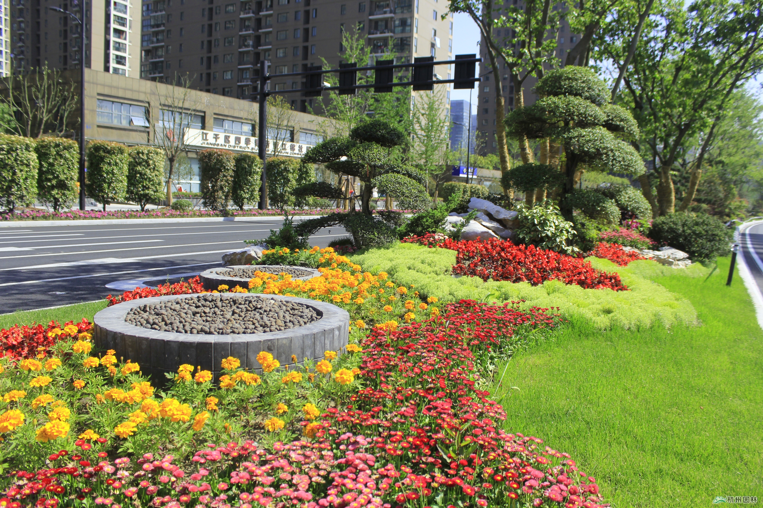作為項目的施工方,為保證精品工程的創建,杭州園林在組織一支優秀施工團隊的同時,大膽嘗試運營新的組織架構,采用工程設計部+技術服務部的模式。其中,工程設計部協助項目經理與施工員,根據現場進行深化、優化設計,形成可操作、可落地的施工圖設計;技術服務部則由常務副總裁、景觀效果總監李壽仁親自帶領一支經驗豐富的專業技術隊伍,為項目建設提供景觀營造專業的現場技術服務與支撐。在造園手法上打破常規,把群落組合與盆景化手法運用于城市道路中央分隔帶,成為全國范圍內的一次創新之舉。