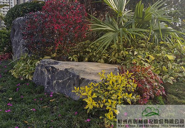 項目中應用了許多景石,為了避免出現視覺的疲憊,每塊景石的形態、大小、植物配置都各有千秋。在一些入口和節點處,通過景石與色葉植物、開花植物、球類植物的有機搭配,營造出一個個意趣盎然的花境景觀。