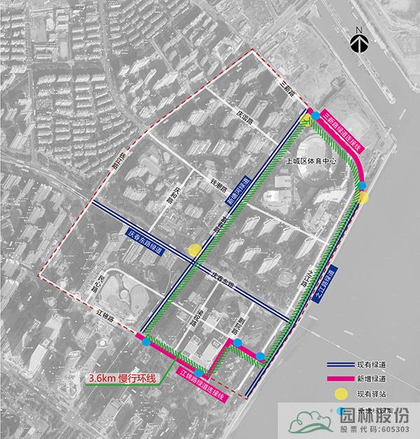 設計策略:將紅線范圍內現有綠道,通過微改造,整合串聯現有慢行步道、沿河綠道、沿江綠道,形成3.6km的慢行環線,并納入杭州綠道地圖中。豐富人群出行方式和體驗,提升多路徑可達性。