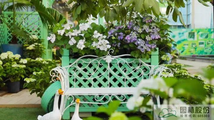 ▲園林股份自主選育的‘青山’系列繡球在畫境·青山湖花園中心室外景觀展示區中的應用