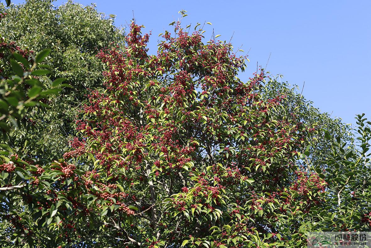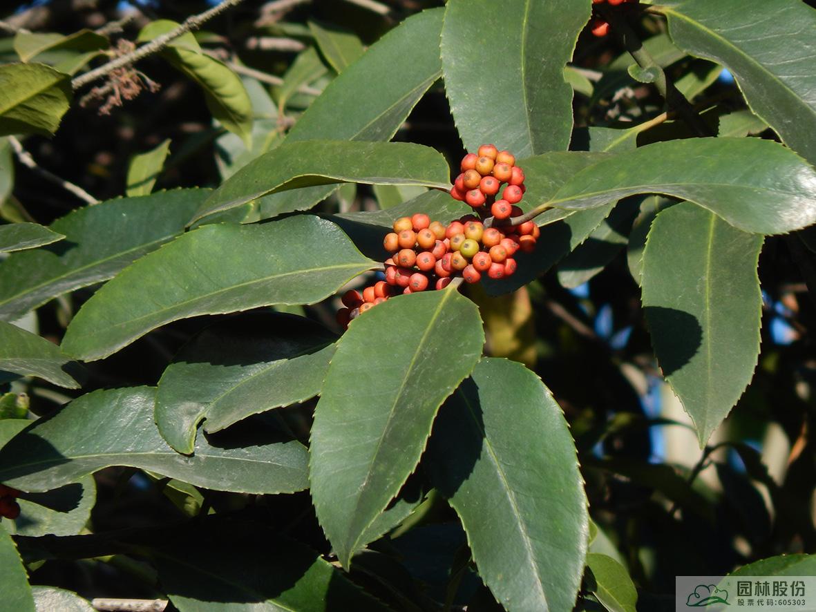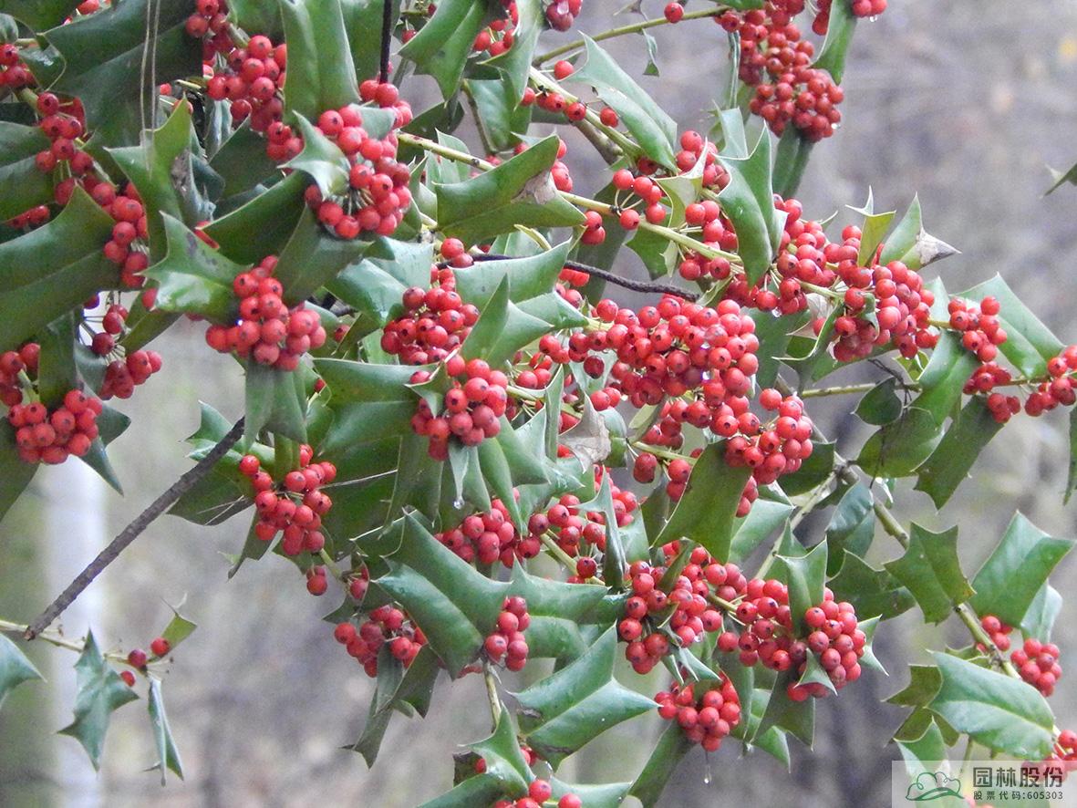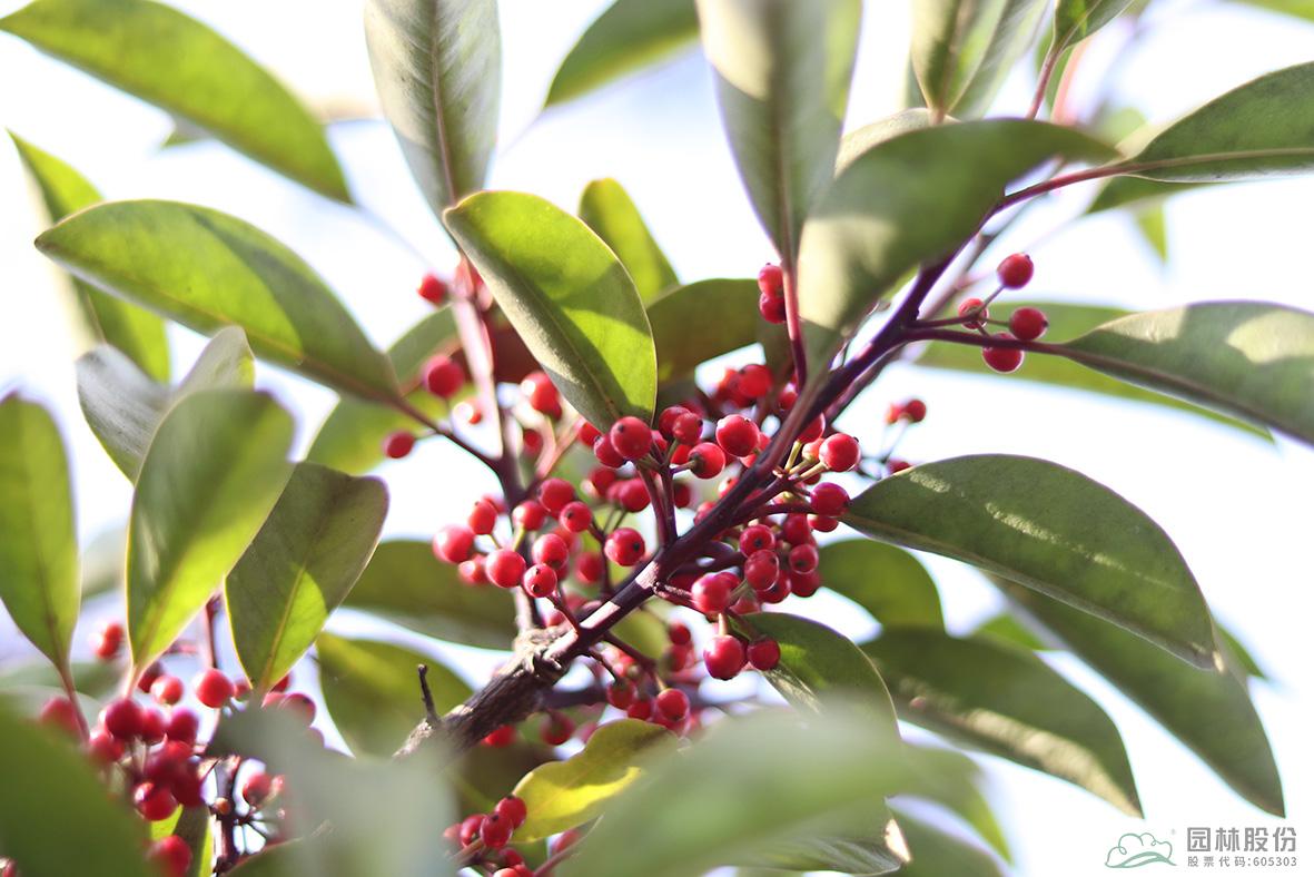 鐵冬青:其葉子四季常青,故名鐵冬青。為常綠喬木或灌木,高可達20米,葉全緣。果實紅色,紅若丹珠,小巧可人。掛果期長,能從10月一直持續(xù)至來年3月。因有多子多孫,興旺發(fā)達之意,在民間俗稱“萬子千紅樹”。樹皮或根皮為中藥“救必應(yīng)”,具清熱解毒,利濕的功效。為優(yōu)良觀果樹種,適宜在園林中孤植或群植。