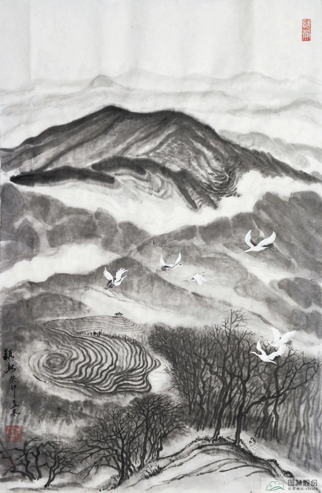 其中,杭州市園林綠化股份有限公司辦公室主任李穎新以徑山美景為創作內容的書畫作品成功入選前20名。作品以杭州徑山及國家級美麗休閑鄉村-小古城村的自然景觀、鄉村風情、茶園風貌、翩翩白鷺等作為創作素材,主要表達在新時代背景下,隨著鄉村振興戰略的全面推進,一幅幅人與自然和諧共生的美麗畫卷正在神州大地徐徐展現。圖中山巒起伏、云霧氤氳、茶園連綿、溪水潺潺、白鷺紛飛……共同繪就一幅意境唯美的鄉村風情畫卷,留下一段令人念念不忘的鄉愁記憶。